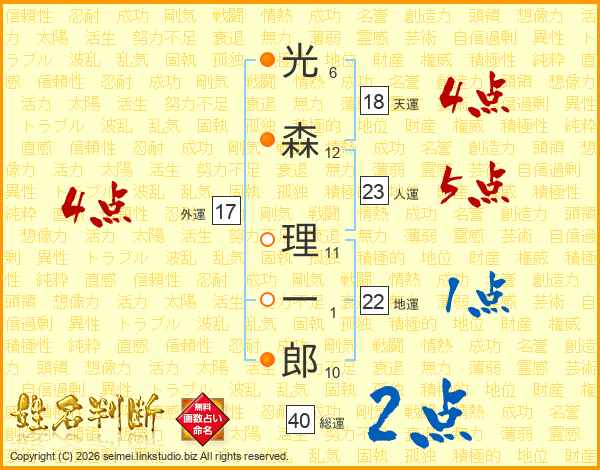 光(6画)森(12画) 理(11画)一(1画)郎(10画)