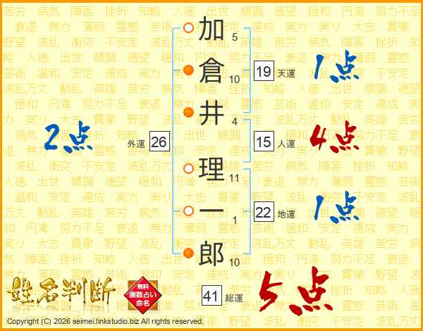 加(5画)倉(10画)井(4画) 理(11画)一(1画)郎(10画)