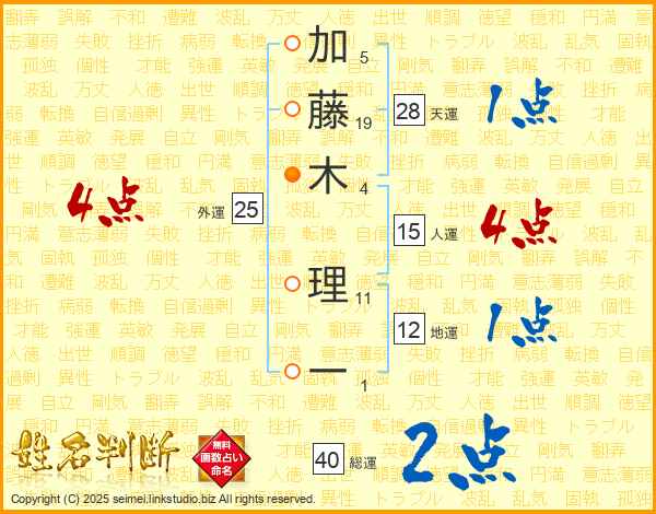 加(5画)藤(19画)木(4画) 理(11画)一(1画)