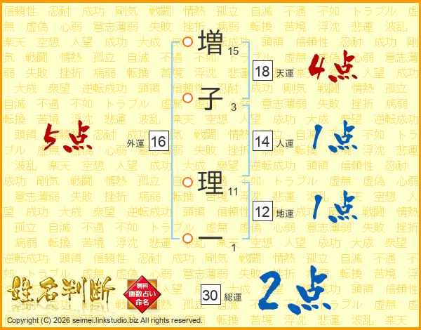 あなたの人生を表す1番重要な運勢です。生涯を通じて影響する総合運となり、主に50歳以降の晩年期に影響を及ぼします。苗字と名前の合計画数。