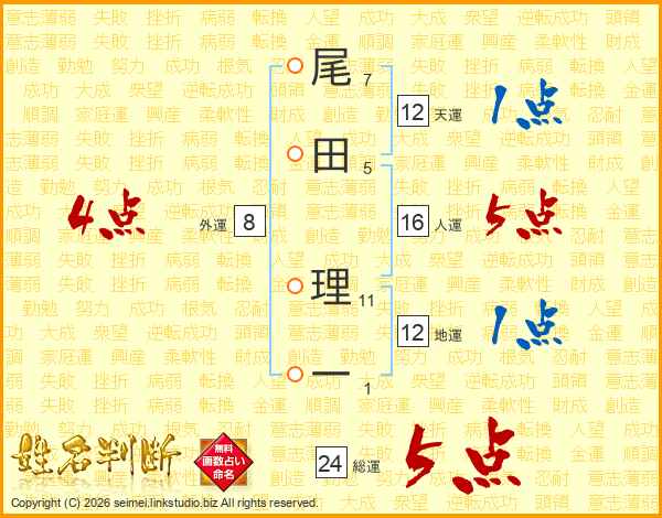 生活面を象徴する運勢です。外部から受ける影響力を表し、結婚運、家庭運や職場、環境への順応性を表します。総運から人運を引いた画数。姓や名が1文字の場合を除く。