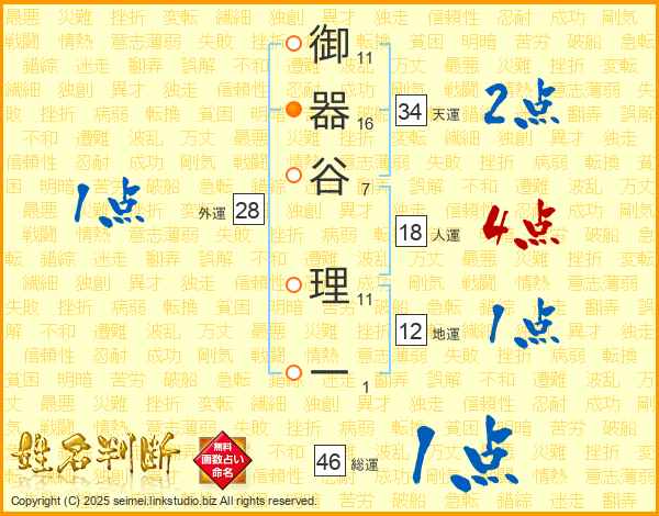 御(11画)器(16画)谷(7画) 理(11画)一(1画)