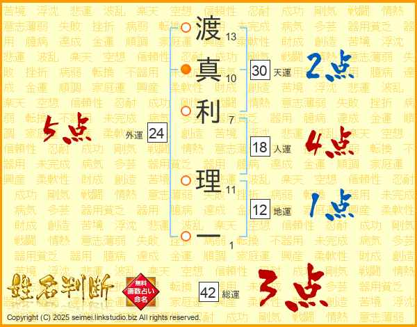 渡(13画)真(10画)利(7画) 理(11画)一(1画)