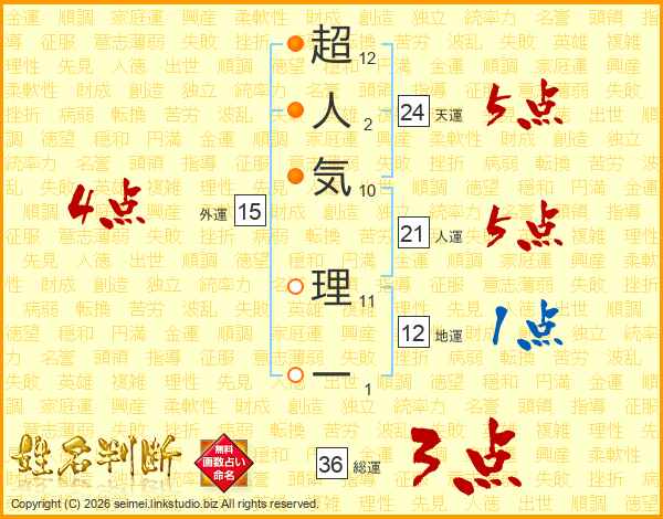 超(12画)人(2画)気(10画) 理(11画)一(1画)