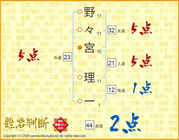 野(11画)々(11画)宮(10画) 理(11画)一(1画)