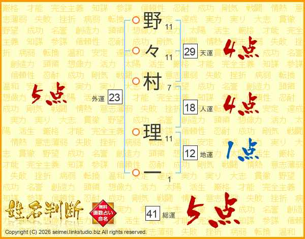 野々村理一さんの総運は41画の5点!