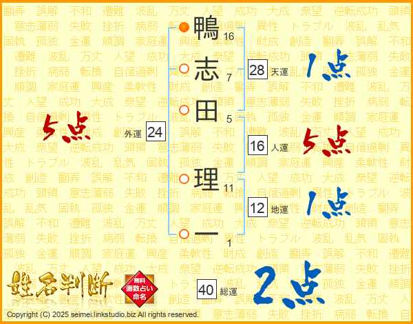 鴨(16画)志(7画)田(5画) 理(11画)一(1画)