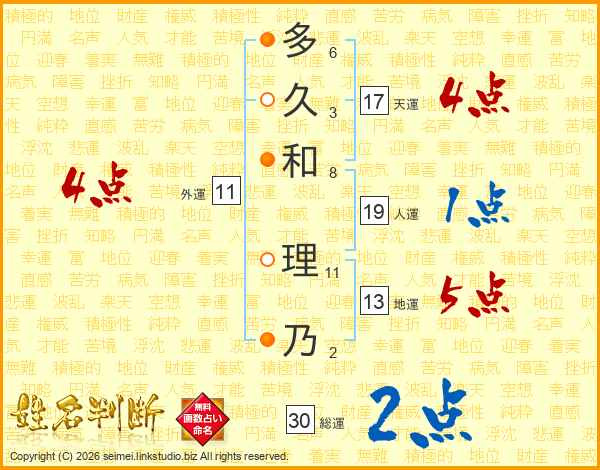 多(6画)久(3画)和(8画) 理(11画)乃(2画)