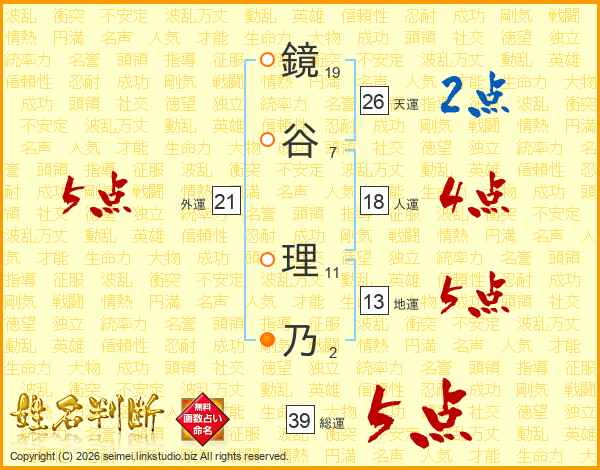 鏡(19画)谷(7画) 理(11画)乃(2画)