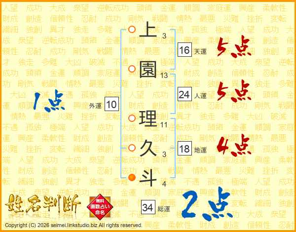 上(3画)園(13画) 理(11画)久(3画)斗(4画)