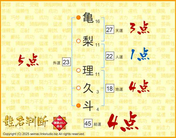 亀(16画)梨(11画) 理(11画)久(3画)斗(4画)