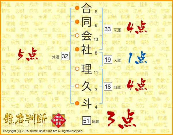 合(6画)同(6画)会(13画)社(8画) 理(11画)久(3画)斗(4画)
