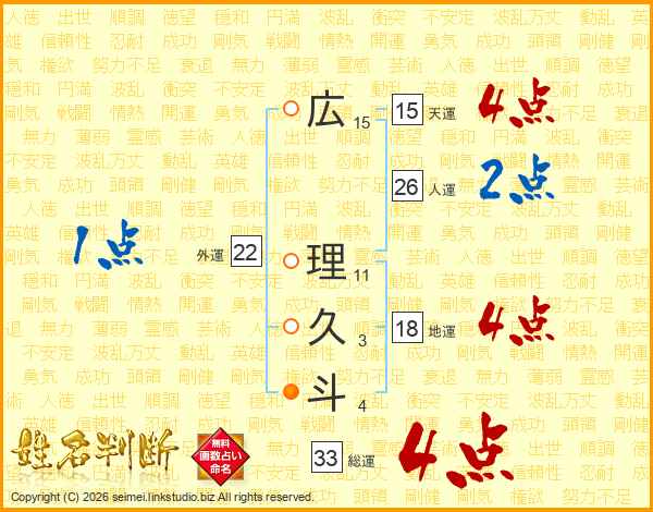 広理久斗さんの総運は33画の4点!