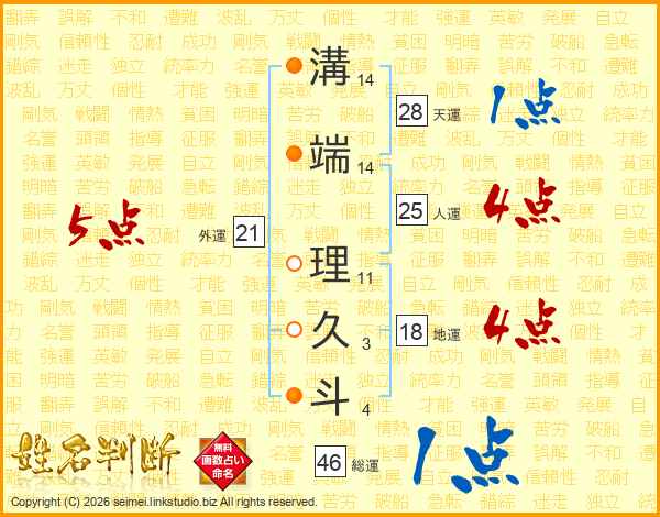 溝(14画)端(14画) 理(11画)久(3画)斗(4画)