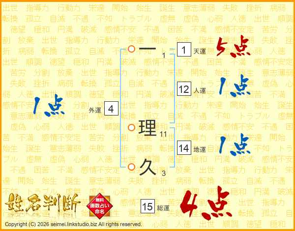 生活面を象徴する運勢です。外部から受ける影響力を表し、結婚運、家庭運や職場、環境への順応性を表します。総運から人運を引いた画数。姓や名が1文字の場合を除く。