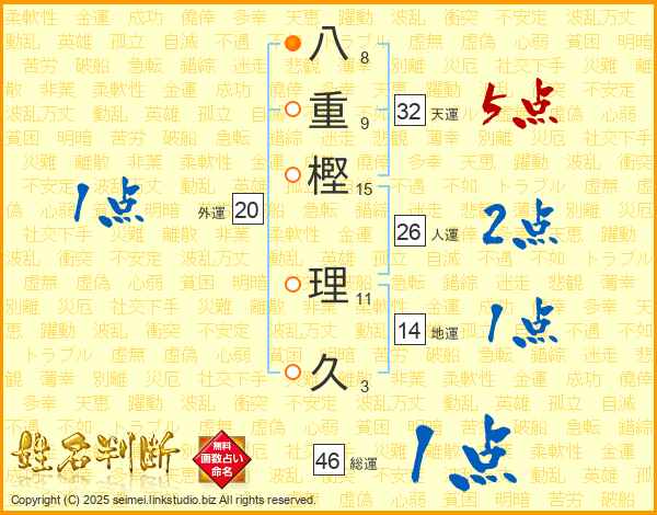 八(8画)重(9画)樫(15画) 理(11画)久(3画)