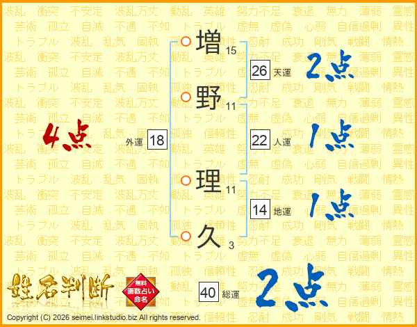 生活面を象徴する運勢です。外部から受ける影響力を表し、結婚運、家庭運や職場、環境への順応性を表します。総運から人運を引いた画数。姓や名が1文字の場合を除く。