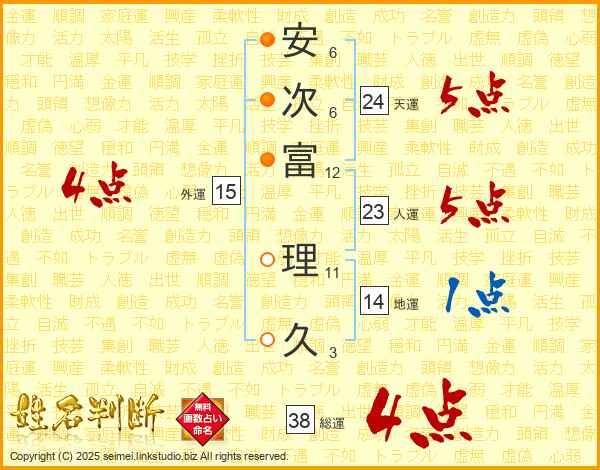 安(6画)次(6画)富(12画) 理(11画)久(3画)