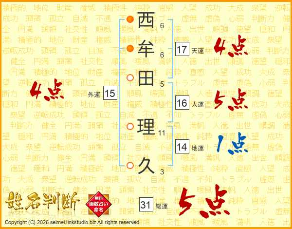 西牟田理久さんの総運は31画の5点!