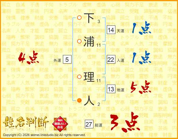 下浦理人さんの地運は13画の5点!