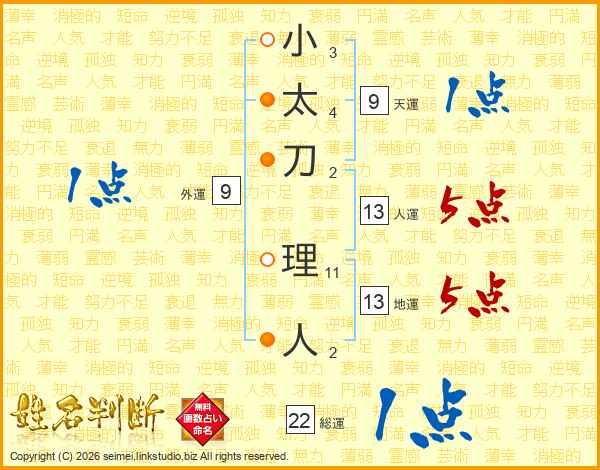 小太刀理人さんの総運は22画の1点!