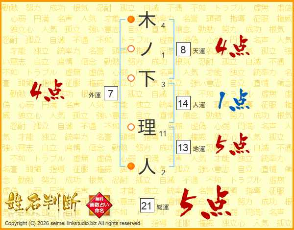 木(4画)ノ(1画)下(3画) 理(11画)人(2画)