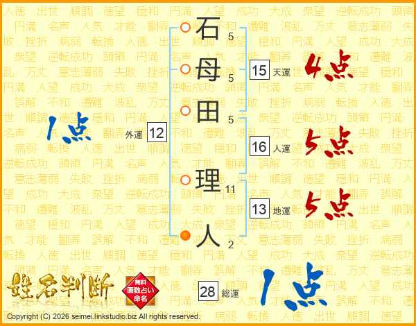石(5画)母(5画)田(5画) 理(11画)人(2画)