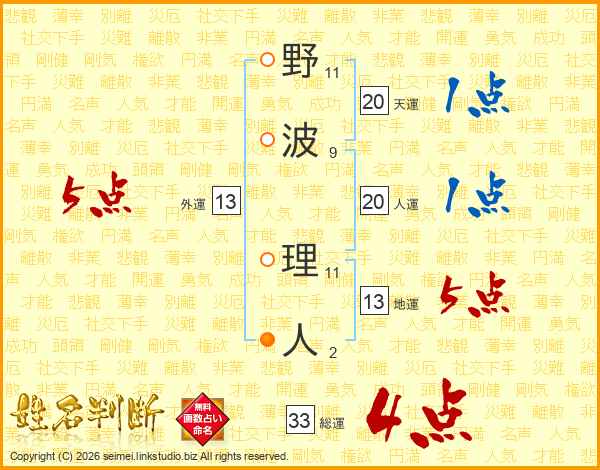 野(11画)波(9画) 理(11画)人(2画)