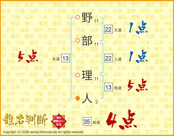 野部理人さんの総運は35画の4点!