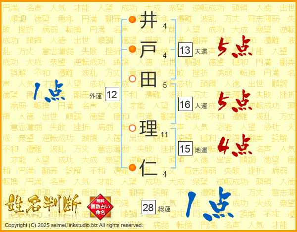 井(4画)戸(4画)田(5画) 理(11画)仁(4画)