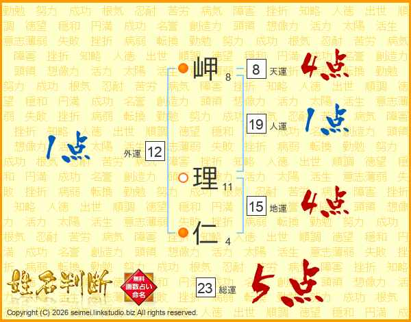 生活面を象徴する運勢です。外部から受ける影響力を表し、結婚運、家庭運や職場、環境への順応性を表します。総運から人運を引いた画数。姓や名が1文字の場合を除く。