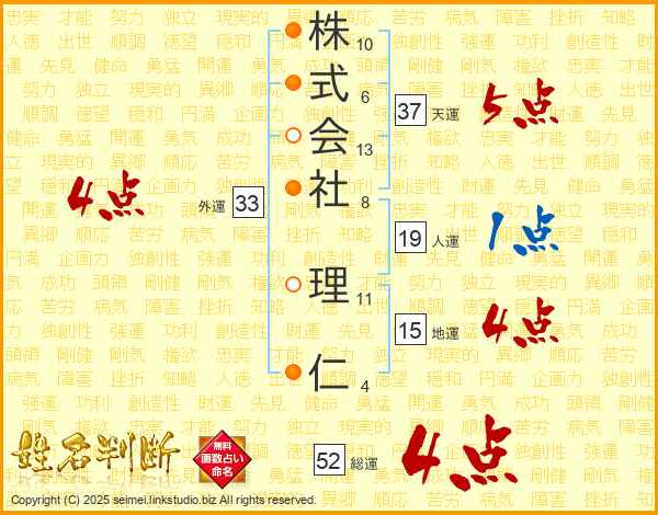 株(10画)式(6画)会(13画)社(8画) 理(11画)仁(4画)
