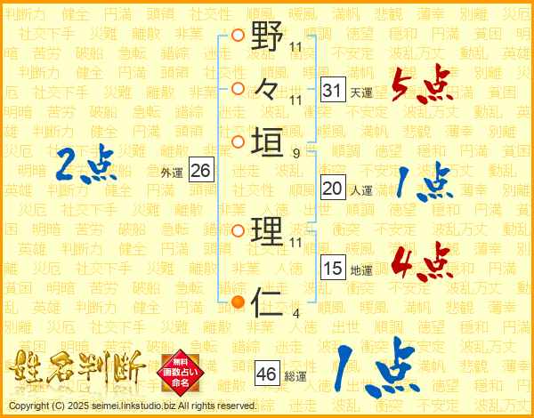 野(11画)々(11画)垣(9画) 理(11画)仁(4画)
