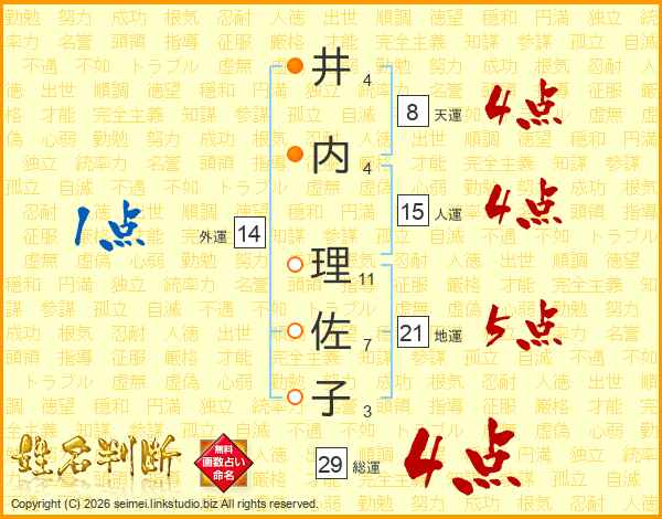 井(4画)内(4画) 理(11画)佐(7画)子(3画)