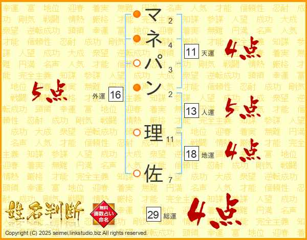 マ(2画)ネ(4画)パ(3画)ン(2画) 理(11画)佐(7画)