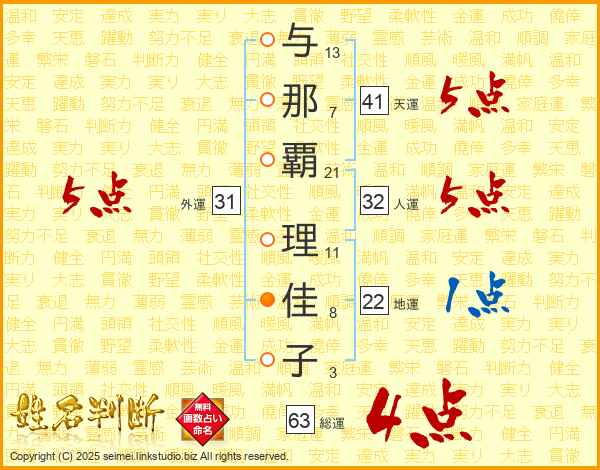 与(13画)那(7画)覇(21画) 理(11画)佳(8画)子(3画)
