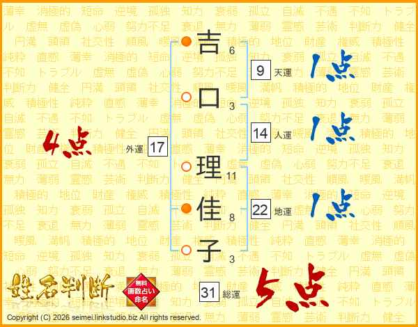 吉(6画)口(3画) 理(11画)佳(8画)子(3画)