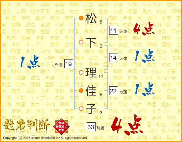 松(8画)下(3画) 理(11画)佳(8画)子(3画)