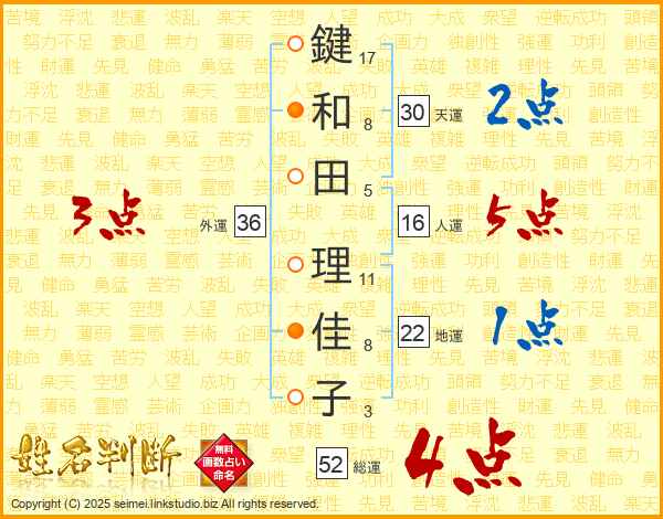 鍵(17画)和(8画)田(5画) 理(11画)佳(8画)子(3画)