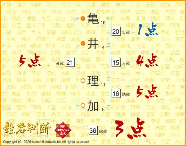 亀(16画)井(4画) 理(11画)加(5画)