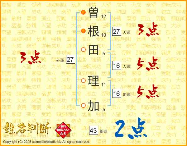 曽(12画)根(10画)田(5画) 理(11画)加(5画)