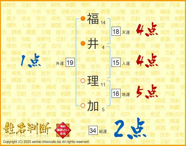 生活面を象徴する運勢です。外部から受ける影響力を表し、結婚運、家庭運や職場、環境への順応性を表します。総運から人運を引いた画数。姓や名が1文字の場合を除く。