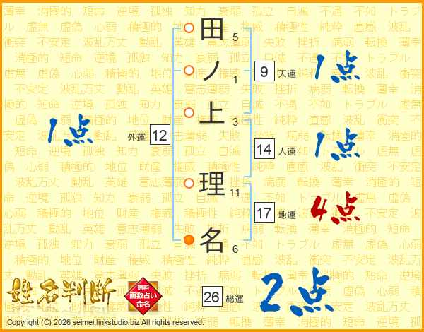田(5画)ノ(1画)上(3画) 理(11画)名(6画)