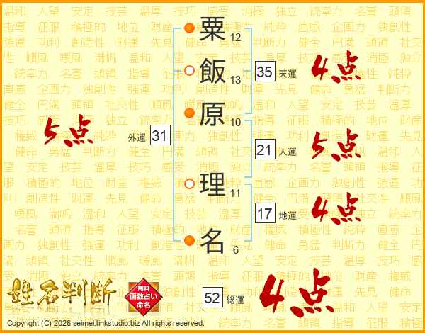 粟飯原理名さんの総運は52画の4点!