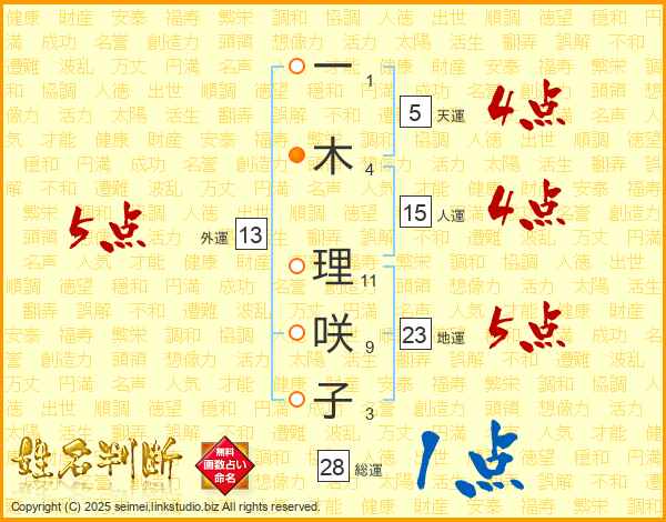 一(1画)木(4画) 理(11画)咲(9画)子(3画)