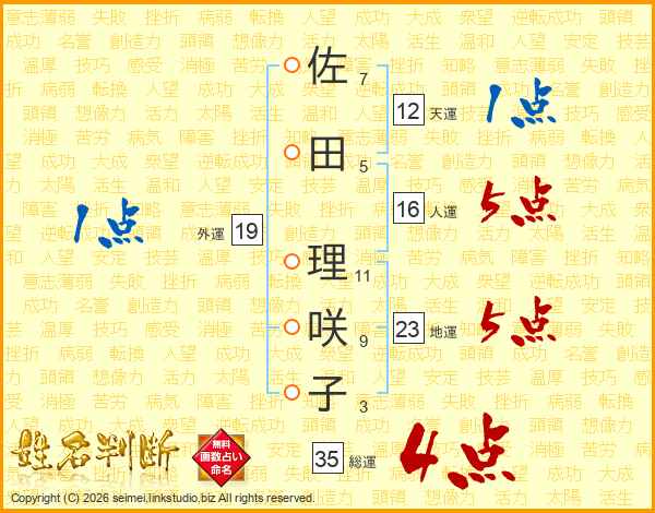 佐(7画)田(5画) 理(11画)咲(9画)子(3画)