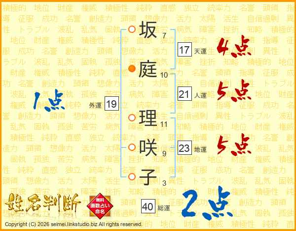 坂(7画)庭(10画) 理(11画)咲(9画)子(3画)