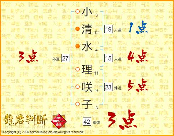 小(3画)清(12画)水(4画) 理(11画)咲(9画)子(3画)