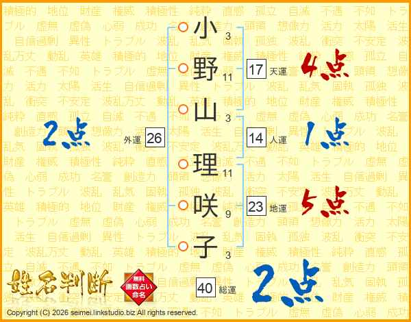 小(3画)野(11画)山(3画) 理(11画)咲(9画)子(3画)