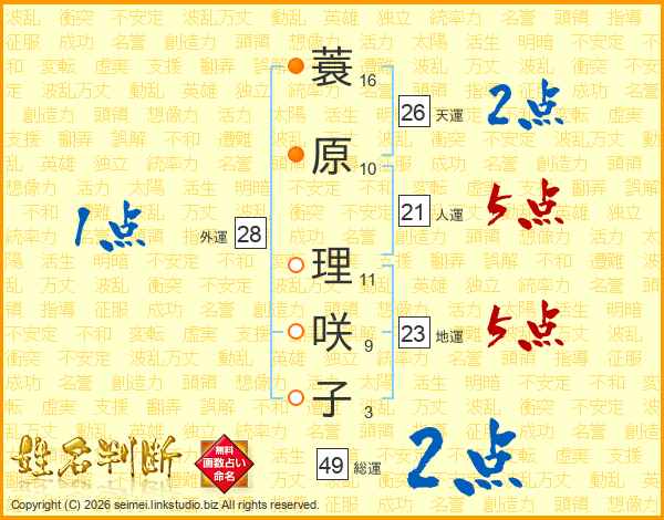 蓑原理咲子さんの総運は49画の2点!